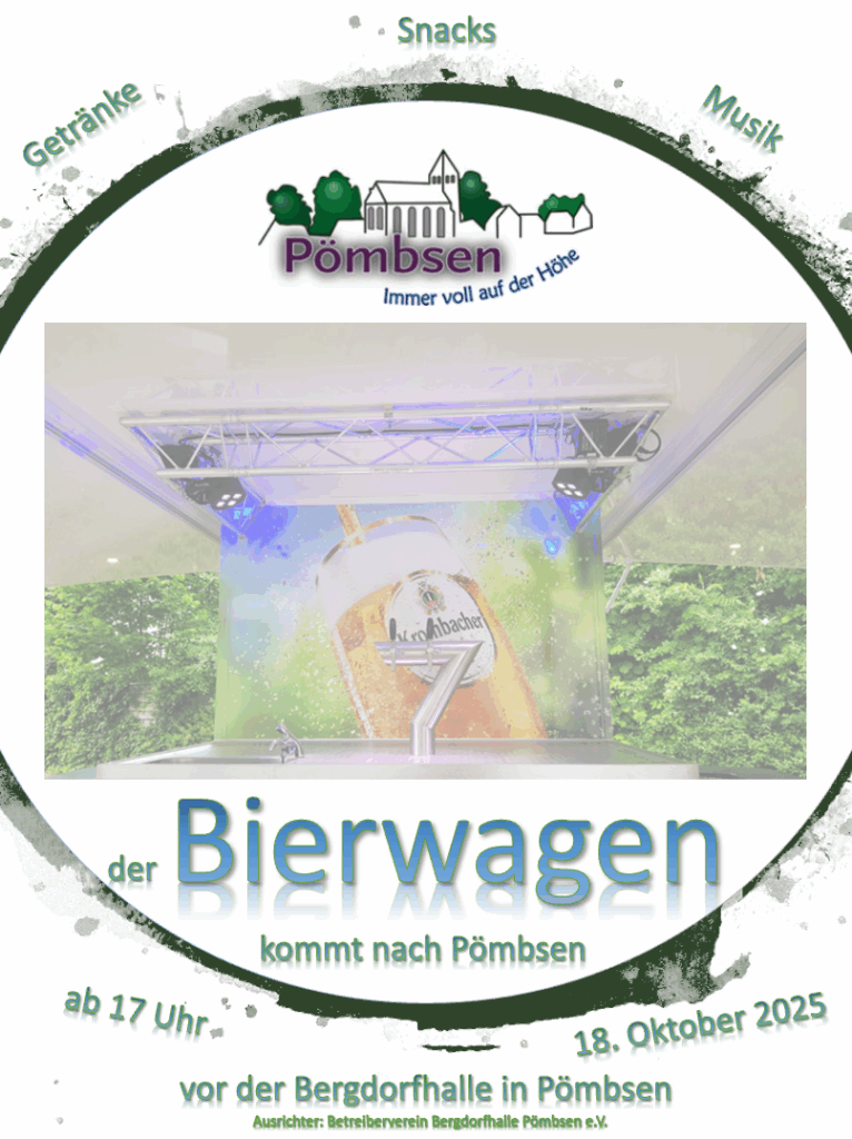 Aktion Bierwagen in Pömbsen in Betreiberverein Pömbsen, Kultur, Vereine Datum 18. Oktober 2025 Zeit 17:00 Ausrichter: Betreiberverein Bergdorfhalle Pömbsen e.V.
