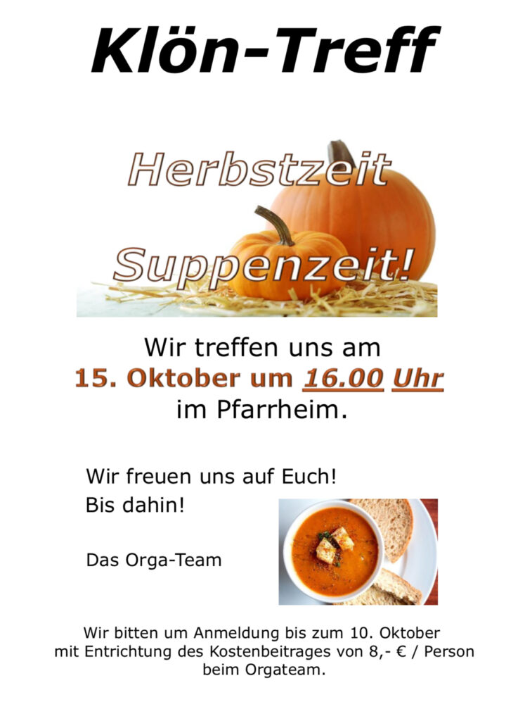 Klön Treff – Herbstzeit Suppenzeit! in Seniorengemeinschaft Datum 15. Oktober 2025 Zeit 16:00 Pfarrheim Kreuzstraße 16 33014 Bad Driburg