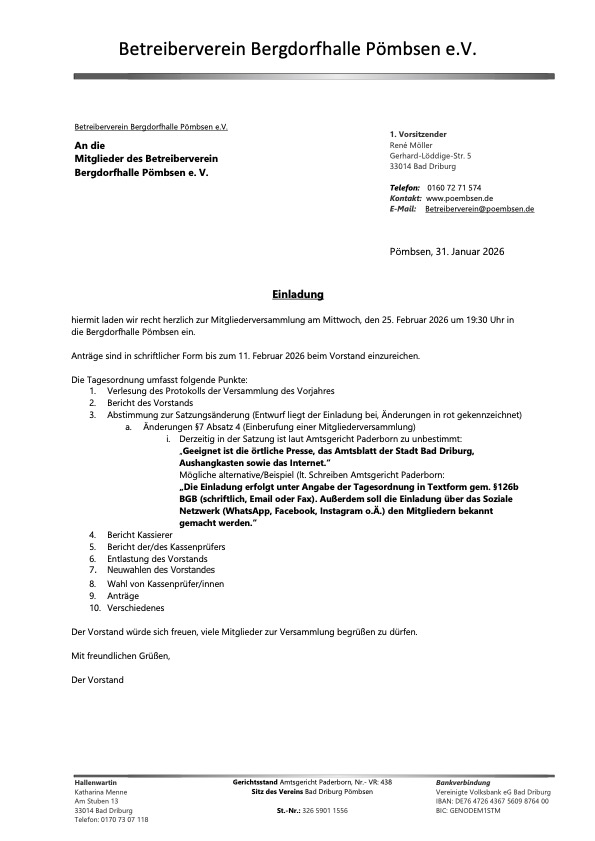 die schriftliche Einladung an alle Mitglieder erfolgt am 31.01.2026 per E-Mail bzw. per Post (von den Mitgliedern die keine E-Mail hinterlegt haben).